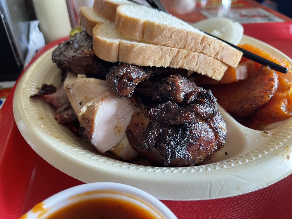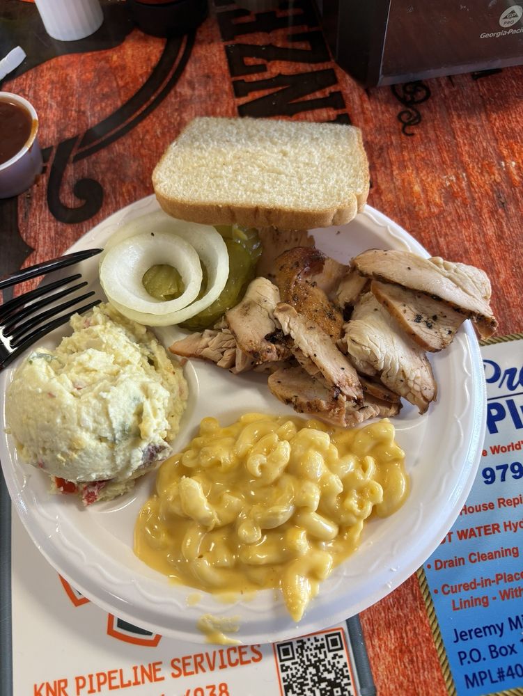 One Meat (beef, sausage, pork, turkey or chicken breast) / two sides